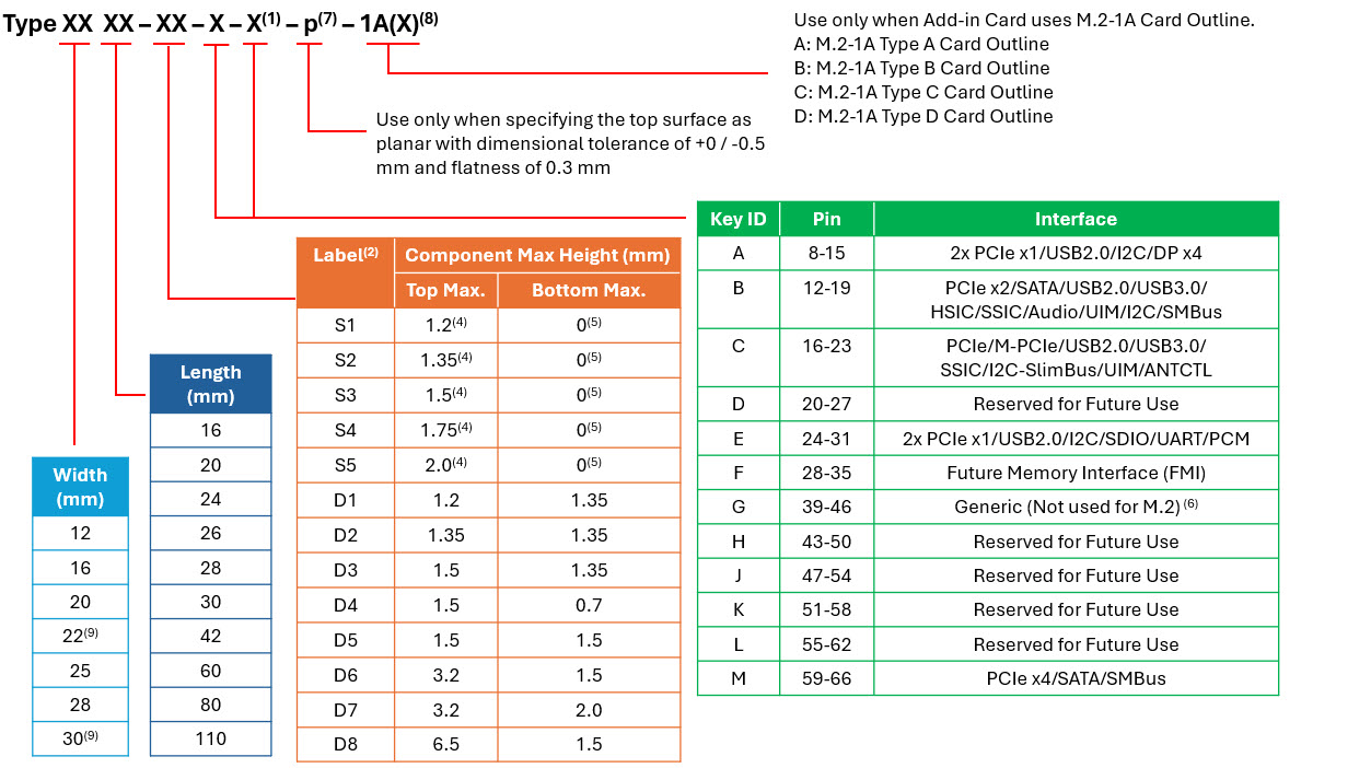 下表列出了PCI Express M.2规范5.1版中有关M.2命名方式的详细信息